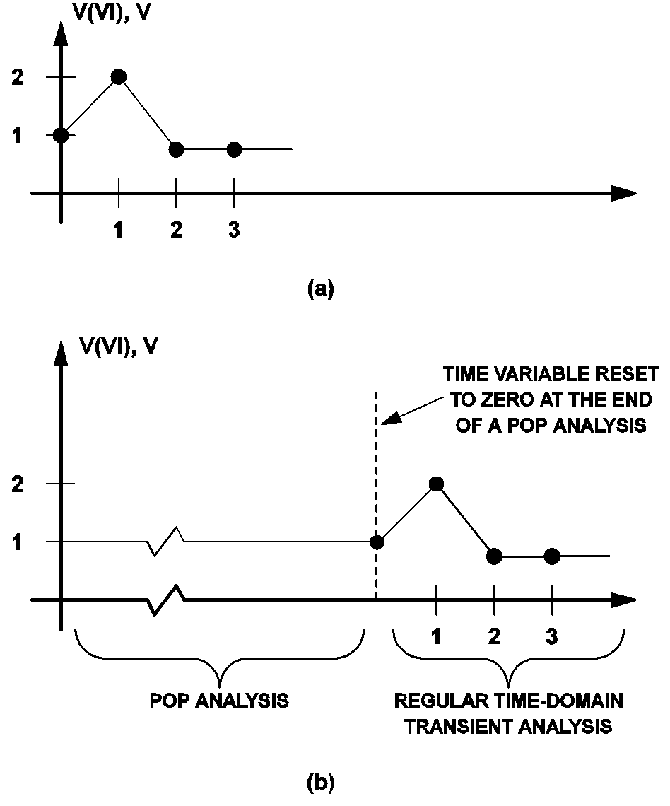 Aperiodic sources are held at a constant value during the POP analysis. This is necessary in order to find the periodic operating point. After the POP analysis has finished, the source values of the aperiodic sources are allowed to be time varying according to their definition in the input file. Take the piecewise-linear source defined in the following lines of statements as an example.