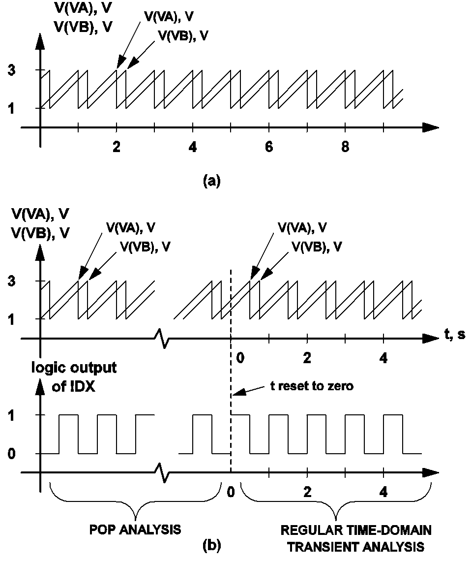 10.5 (a) Waveforms of two periodic sawtooth voltage sources VA and VB when no periodic operating point analysis is carried out, and (b) Waveform of the same voltage source when a periodic operating point analysis is carried out. The start of a switching cycle is defined as occurring when the output of the logic gate !DX is making a 0 to 1 transition.