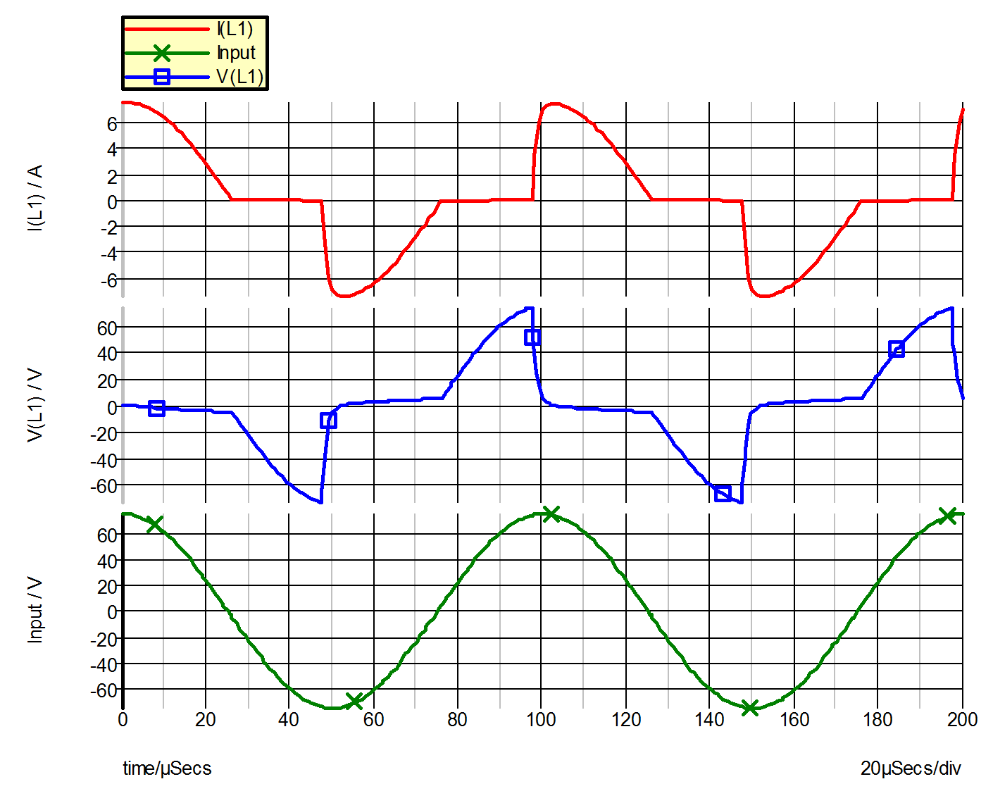 * Cosine Wave Driving A Resistor And A Saturable Inductor VI 1 0 COS VOFFSET=0 APEAK=75 FREQ=10K .PRINT ALL .OPTIONS PSP_NPT=201 .TRAN 200u 0 V1 1 0 COS VOFFSET=0 APEAK=75 FREQ=10k TDELAY=0 + OFF_UNTIL_DELAY=NO DAMP_COEF=0 !L$L1 2 0 L1$TP_SSPWLL .MODEL L1$TP_SSPWLL PWLL NSEG=3 X0=-0.1 Y0=-500.5U + X1=-0.05 Y1=-500U X2=0.05 Y2=500U X3=0.1 Y3=500.5U R1 2 1 10 .END