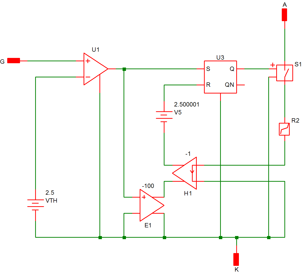 In this example, the SCR is modeled by the series combination of the simple switch S1 and the piecewise-linear resistor !R2, as shown in fig 9.21. The input file for this circuit is shown in fig 9.22. The comparator U2 (!D$U2 in the input file), the SR Flip Flop U1 (!D$U1 in the input file), and the elements E1, H1, and V5 together form a network that models the switching of the SCR. When a sufficient gate current is applied between the gate and the cathode, causing the voltage across the non-inverting input of U2 to exceed 2.5 V, the output of U2 will rise to approximately 5 V, thus setting the SR Flip Flop, which in turn causes the switch S1 to be closed. When S1 is closed, the model characteristic from anode to cathode is the series combination of a small resistance of the switch and a diode. On the other hand, if the SR flip flop is reset, the switch S1 will be opened, and the model characteristic from anode to cathode looks like a large resistor in series with a diode. The flip flop is reset when the voltage across its reset input, which is equal to the sum of the voltages across E1, H1, and V5, exceeds 2.500001 V. This situation occurs when the gate signal is absent and the current through the SCR is negative. The presence of E1 makes sure that the reset input does not reach its threshold value of 2.500001 V whenever there is a gate signal present. E1 accomplishes this by having its output equal to 500 V whenever the output of U2 reaches 5 V.