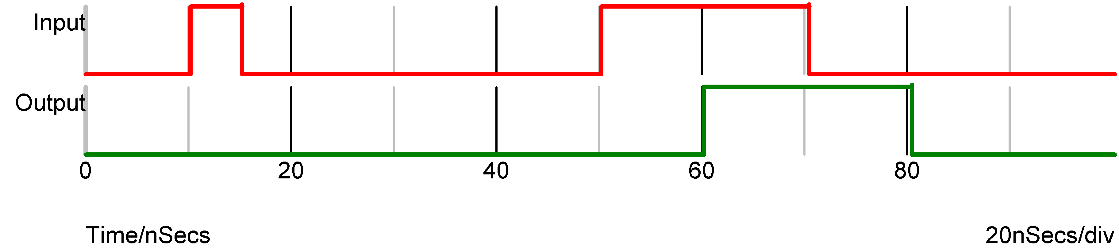 Most digital devices have at least one model parameter that specifies a time delay. Unless otherwise noted, all delays are inertial. This means that glitches shorter than the delay time will be swallowed and not passed on. For example, the following waveforms show the input and output of a gate that has a propagation delay of 10nS. The first pulse is only 5nS so does not appear at the output. The second pulse is 20nS so therefore is present at the output delayed by 10nS.