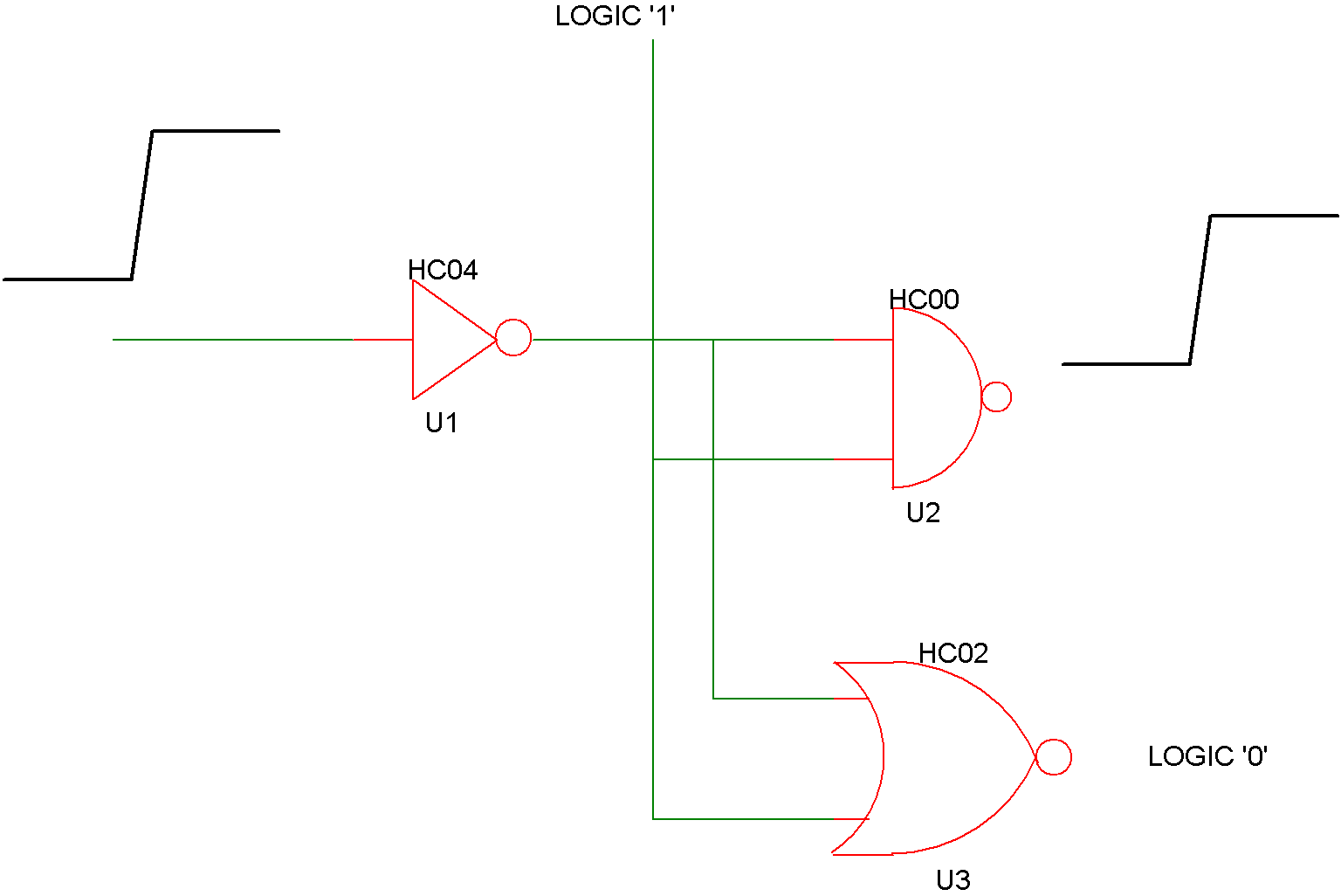 U1 receives an event, a rising edge at its input at time = T. U1 has a propagation delay of 5.5nS, so on receipt of the event at its input, U1 posts an event at its output with a time T+5.5nS. At that time this event is received by U2 and U3. U3 does not respond to this event because one of its inputs is permanently at logic '1' so its output will always be low. U2, however, does respond and creates a low-high event at a time delayed by its propagation delay of 6.5nS i.e. T+5.5nS+6.5nS. Any device with an input connected to the output of U2 will process this new event and so the process continues.
