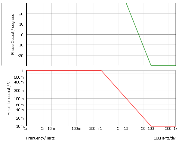 The above defines a response with a gain of 1 and a phase shift of 30 degrees from 0.01Hz to 1Hz. From 1Hz to 10Hz the gain falls from 1 to 0.1 with the phase shift remaining at 30 degrees. From 10Hz to 100Hz the gain falls from 0.1 to 0.01 and the phase changes from 30 to -30 degrees.