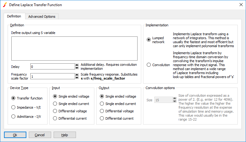 The SIMetrix Laplace transfer function device features two different methods of implementation, namely "lumped network" and "convolution". The lumped network implementation is fast and efficient and may be used for transfer functions that can be represented in polynomial form. The convolution method is more general purpose and can model a wide range of transfer functions. High performance is achieved by using a fast FFT-based convolution method.