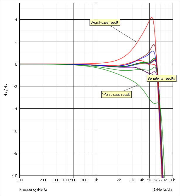 The outlying green and red curves are the worst-case results while the remaining curves are the sensitivity results. Each of the sensitivity curves is the result of running the simulation with a single component value perturbed so that it is set to its highest value within the tolerance specification. The worst-case curves are the result of running the simulation with all components perturbed at one or other tolerance extreme. Which extreme to use is determined from an analysis of the sensitivity results so as to maximise and minimise the sensitivity measurement function.