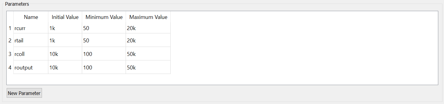 Defines the parameters to be varied during the optimisation process. The parameters are variables that may be used to define any component or model parameter in the same way as .PARAM values in SIMetrix simulations and .VAR values in SIMPLIS simulations. You must at the minimum define an initial value for each parameter. The minimum and maximum values are optional. If specified the optimiser will not attempt values outside the minimum and maximum range.