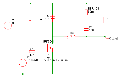 The circuit is the switching stage of a simple step-down (buck) regulator designed to provide a 3.3 V supply from a 9V battery. The circuit has been stripped of everything except bare essentials in order to investigate power dissipation and current flow. Currently, it is a little over simplified as the inductor is ideal. More of this later. We will now make a few measurements. First, the power dissipation in Q1: