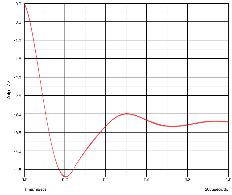 If you have any graph windows open, you should now close them. Once you have loaded or entered the circuit, press F9 or use the schematic Simulator > Run Schematic menu to start the simulation. This will take somewhat longer than the previous tutorial but still less than 1 second on a modern machine. This is the graph you will see