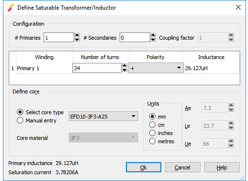 2. Select schematic menu Place > Magnetics > Saturable Transformer/Inductor.... A dialog box will be displayed. (See picture below). Select 0 secondaries then enter 34 for the number of turns in primary 1. Next check Select Core Type. Select EFD10-3F3-A25. This is part number for a Ferroxcube ferrite core. This is what you should have: Click Ok to close the dialog box.