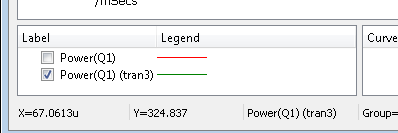 This should display a value of about 517mW. This will be shown in the measurement window below and to the right of the graph plot area. This is the average power over the whole analysis period of 1mS. You can also make this measurement over any period you select using the cursors as described below: