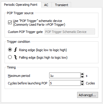 Triggering - Use "POP Trigger" Schematic Device POP analysis requires a trigger signal to indicate the start of each periodic cycle. The best way to define this is using a special schematic part. To place this select menu Place > Analog Functions > POP Trigger. You should check this box if you are using this part.