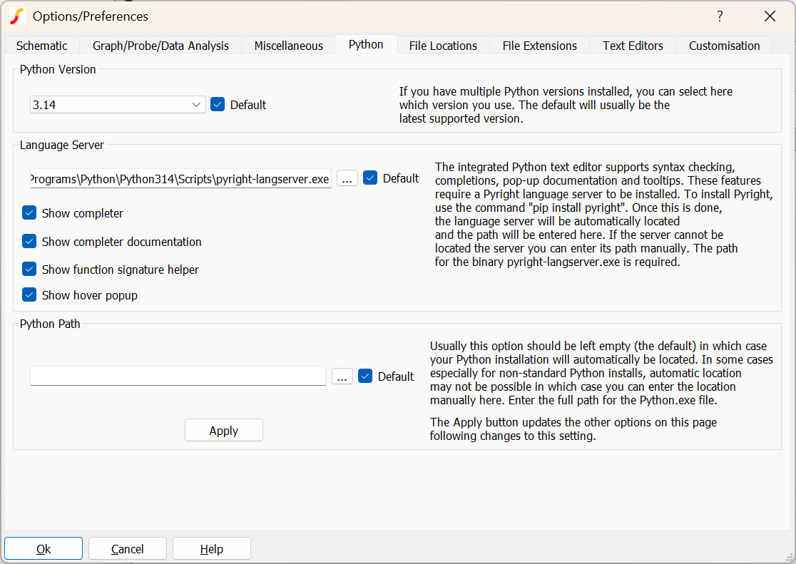Options for the Python interface. See https://help.simetrix.co.uk/9.4/python/ for more information.