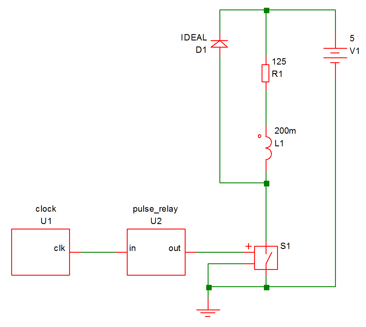 This circuit pulses a relay for 10mS every 100mS driven by a 100kHz clock. The relay coil is modelled by L1 and R1 while D1 is a freewheel diode. S1 is the relay driver and is controlled by the output of U2. This is a simple counter implemented using the following Verilog code: