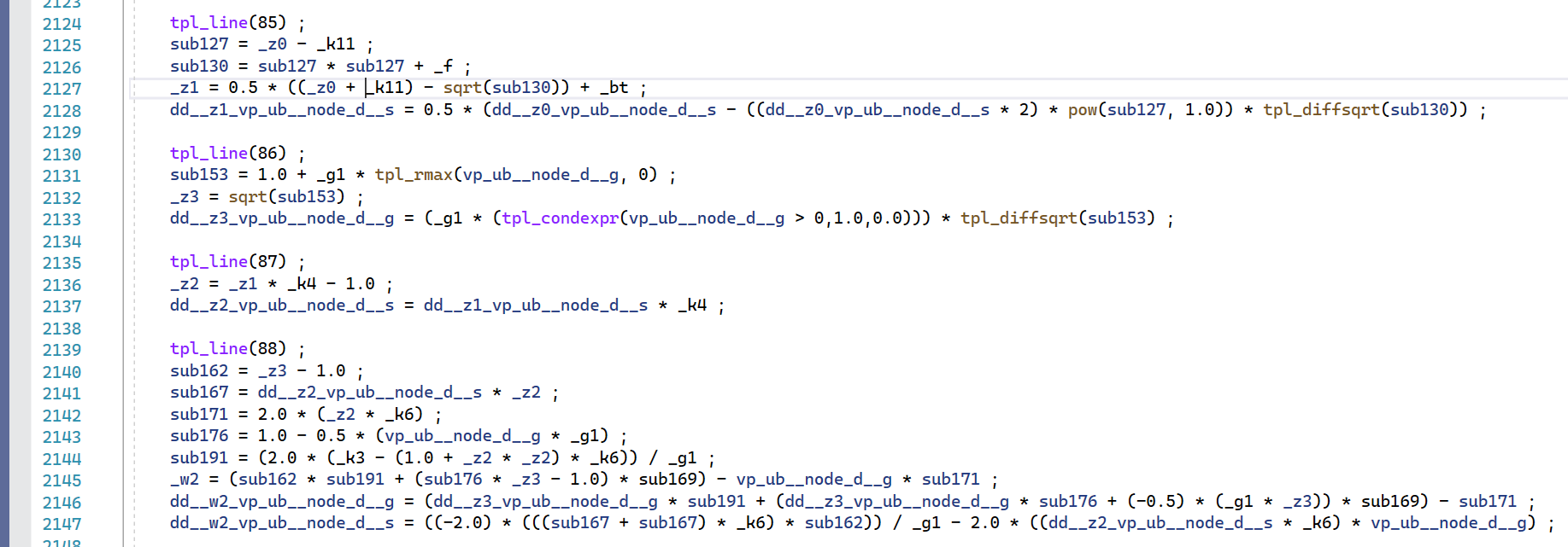 Line 88 for example compiles to 8 lines of 'C'. The first five lines are subexpressions, that is intermediate variables used to evaluate the final result. The final results are the variables _w2 representing the Verilog-A variable w2 along with dd__w2_vp_ub__node_d__g and dd__w2_vp_ub__node_d__s. dd__w2_vp_ub__node_d__g and dd__w2_vp_ub__node_d__s are partial derivatives of w2 with respect to V(node_d,g) and V(node_d,s) respectively. The partial derivatives form part of the iterative equation used to solve the non-linear system.
