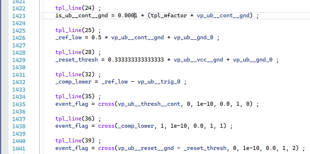 Let's look at the 'C' code and its corresponding Verilog-A code. Note that the line numbers for the Verilog-A code are reported in the 'C' code using the tpl_line macro so we can compare line-by-line.