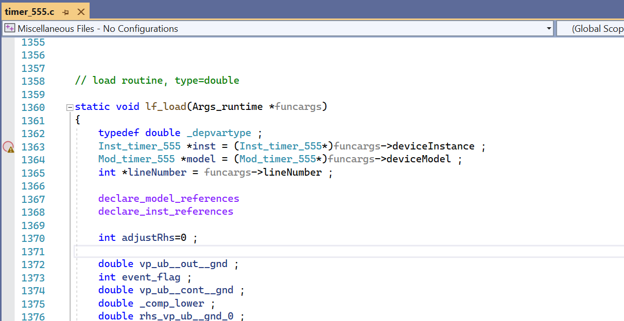 To start a debug session, you first open the 'C' file in Visual studio, then set at least one breakpoint. Next you must attach the Visual Studio debugger to the SIMetrix simulator process which loads the 'C' file. Finally run the simulation until the breakpoint is hit. Here is the detailed procedure for Visual Studio 2022 and 2019. The procedure for older versions is similar but not identical.