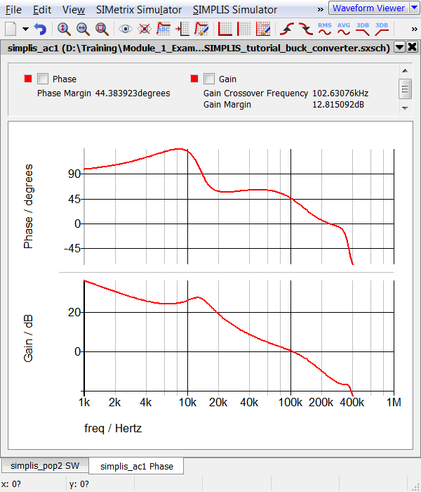 Result: The POP analysis runs on the Synchronous Buck Converter, finding the switching steady-state operating point of the circuit and then runs the AC analysis. The waveform viewer opens with 3 switching cycles of data along with the AC response of the control loop.