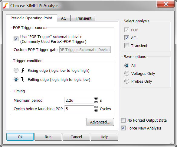 Result: The POP Checkbox is also checked, but disabled - indicating you must run a POP analysis before every AC analysis.
