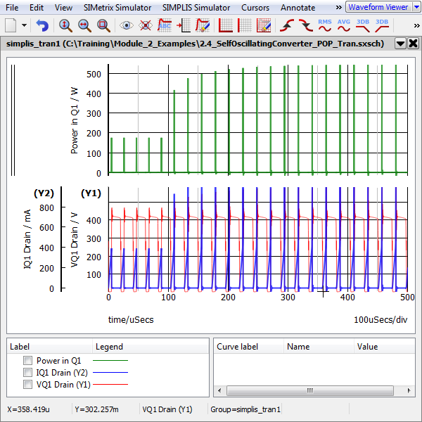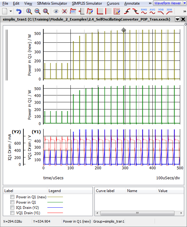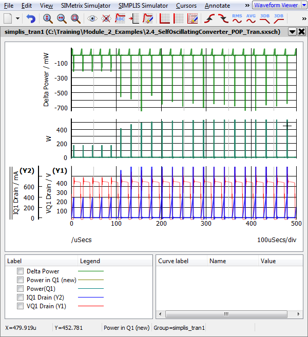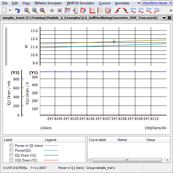 - In the waveform viewer, left-click on the curve with the label Power(Q1)