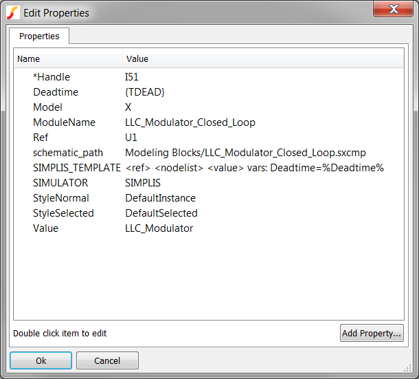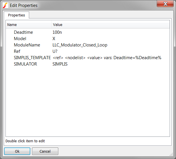 As with the Junction Diode, the instantiated symbol has additional properties, and some properties common to the both the library and instantiated symbols have different values. In particular, the deadtime parameter for the modulator is 100n in the library, but is parameterized on the instantiated symbol.