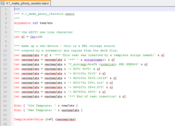 • The model used by the resistor symbol is generated with a templatescript: 4.1_make_phony_resistor.sxscr.