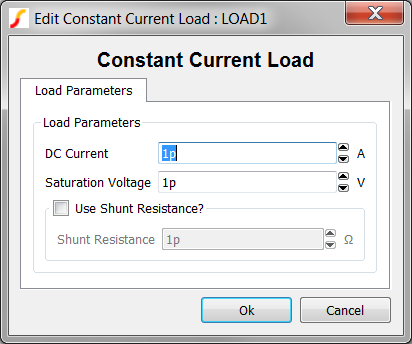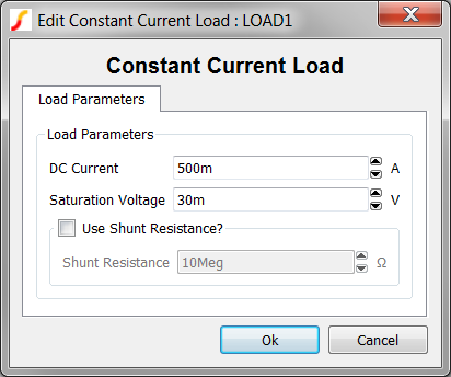 - Change the DC Current value to 500m, and change the Saturation Voltage parameter to 30m and click Ok to accept the dialog. The dialog should appear as follows: