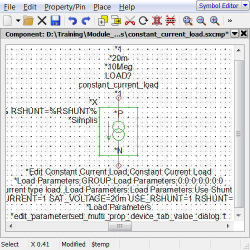 Now that the model and associated symbol are completed, its time to start testing. A testbench schematic for the constant current load is located in the Module_6_Examples directory. After you place the load, this test schematic is ready to simulate. You will then run a few experiments on the model to verify it works as expected.
