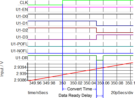 | Data Ready Delay | Delay from when the ADC output changes until the data-ready signal is true | ||||||||||||