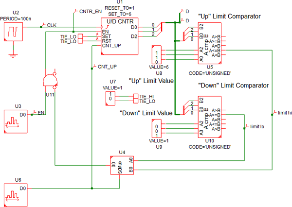 A conceptually simple way to implement roll-over and roll-under protection uses a digital comparator to compare the current output to the desired minimum or maximum count value and to disable the counter via the EN pin. This example uses an up/down counter with the maximum count value limited to 6 and the minimum count value limited to 1. The count value is initialized to 3 using the Initial Condition parameter on the up/down counter.