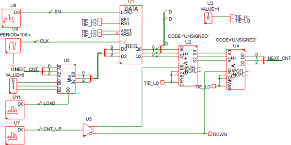 This example uses a SIMPLIS digital register and logic to implement a counter with a load input. In this case, the next count value is calculated with a SIMPLIS adder and subtractor. The input to the register is determined by the load control which is connected to the select pin of the MUX.