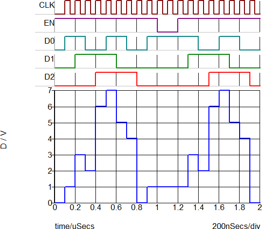 Sample waveforms for the Gray code counter example are shown below. Note the D0, D1, and D2 signals - only one signal changes state at any clock edge.
