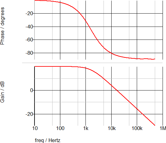 The following AC waveforms confirm that the DC gain is 20dB and the pole is approximately 1.6kHz.