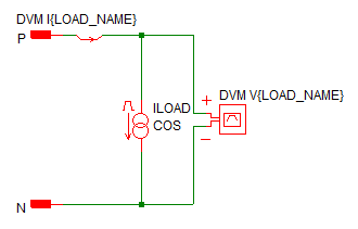 The Cosine Waveform Load subcircuit models a time-varying load with a cosinusoidal current. At time=0, the load begins at the FINAL_CURRENT value and has a cosine function. The Cosine Waveform Load is not used in any test objectives, but you can change any load to a cosine load with a Cos() function call in a Load column.