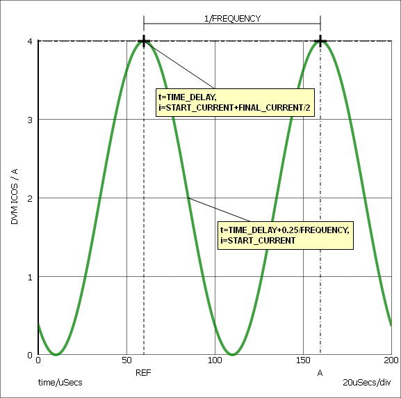 | TIME_DELAY | 10u | Real | min: 0 | s | The delay before the cosinusoid starts. The load behavior before the TIME_DELAY is determined by the OFF_UNTIL_DELAY parameter. |