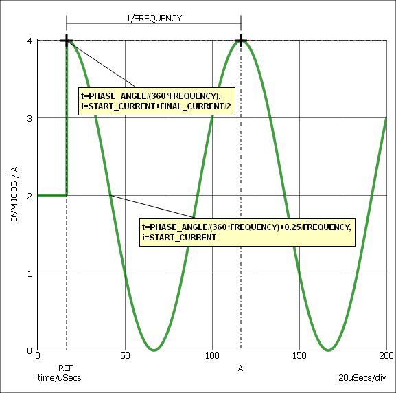In this example the PHASE_ANGLE parameter is set to 60, and the OFF_UNTIL_DELAY is set to 1; therefore, for simulation times less than the time delay defined by the PHASE_ANGLE parameter, the load current is 2A, which is the value of the START_CURRENT argument.