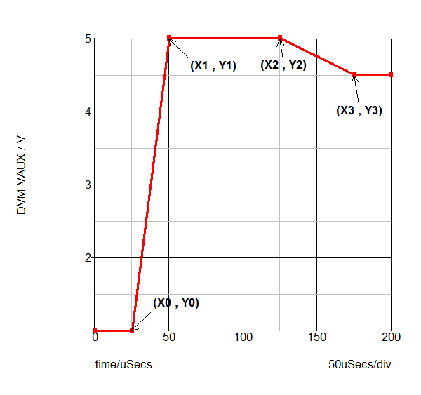 The following example sets the DVM Aux Source with reference designator V5 to a Pulse Aux Voltage Source, with a starting voltage of 1V, a pulse voltage of 5V and a final voltage of 4.5V. Note the rise and fall times are not the same and the pulse does not have to return to the starting voltage value.