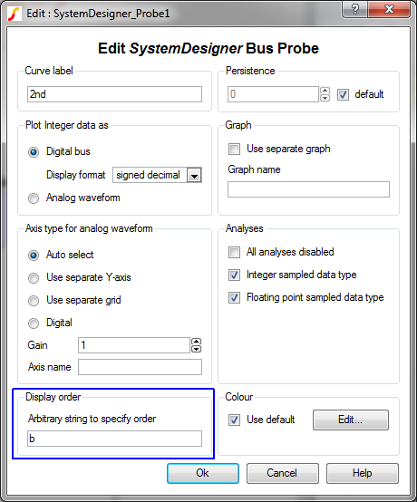 To define the order of other probes, double click the probe and set the Display order in the same way as you set the SystemDesigner bus probe. For the Display order to take effect, the other probes must be output to the digital axis.