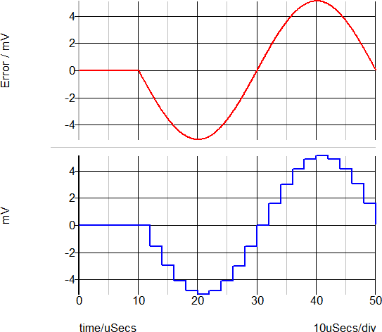 During integer-sampled data simulations, the sine wave voltage is sampled by the ADC and quantized into BIN_SIZE amplitude values. The BIN_SIZE is set to 2mV with a variable in the F11 window of the schematic. The quantized amplitude of the data signal has a maximum value of 3 LSB counts. The output signal is probed with the SystemDesigner probe labeled Data. The DAC then converts the Data value to an analog voltage. Because the gains of the ADC and the DAC are identical, the sampled voltage at the Data bus and the DAC output differ only by a propagation delay.
