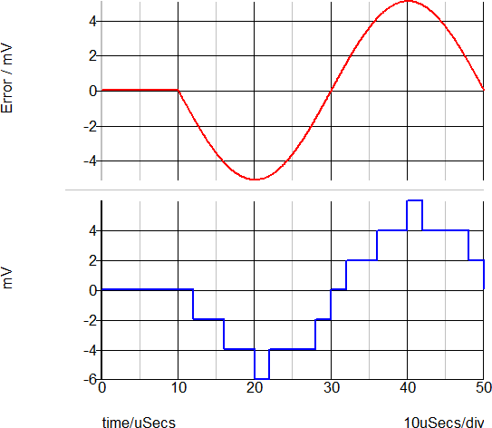 For double-precision floating-point sampled-data simulations, the DAC behaves as a pure gain. The AC Gain is simply the LSB Weight, and there is no phase change. The blue curves are the DAC Gain/Phase; the Purple curve is the ADC Gain/Phase; and the total Gain/Phase is represented by the red curves.
