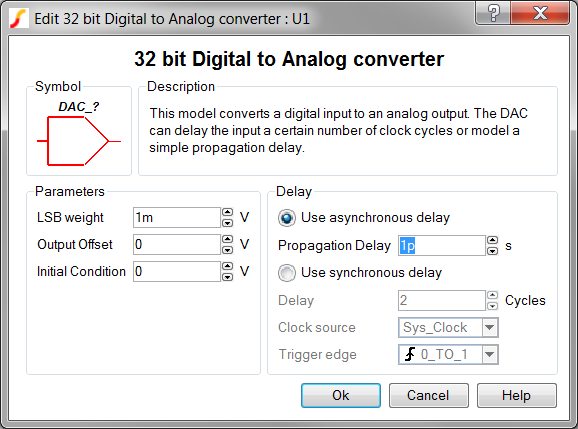 | Delay | The propagation delay from an input change to an output change in number of clock cycles. The output will not change until the number of clock cycles has been reached. The output will then change state only on the selected Clock source edges specified by Trigger edge . This parameter is used only in models with Synchronous delay. |
