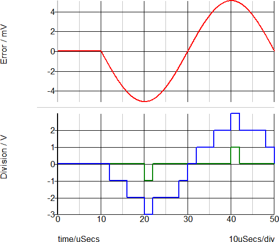 During integer-sampled data simulations, the sine wave voltage is sampled by the ADC and quantized into BIN_SIZE amplitude values. The BIN_SIZE is set to 2mV with a variable in the F11 window of the schematic. The quantized amplitude of both Error signals has a maximum value of 3 LSB counts. The divider then divides the sampled error by the constant value producing: