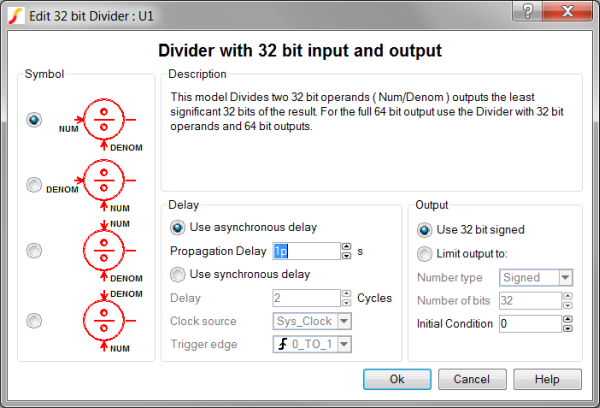 The SystemDesigner Divider models a division operation of two or three SystemDesigner buses with a 32-bit signed-integer or floating-point result. From the Output parameter box, you can limit the resulting output to either signed or unsigned numbers with fewer than 32 bits.