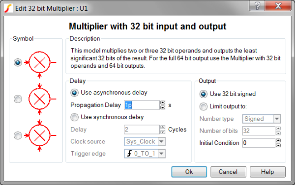 The SystemDesigner Multiplier models a multiplication operation of two or three SystemDesigner buses with a 32-bit signed-integer or floating-point result. From the Output parameter box, you can limit the resulting output to either signed or unsigned numbers with fewer than 32 bits.
