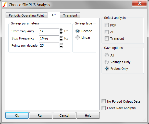 Note: An AC analysis requires that a POP analysis is also defined.