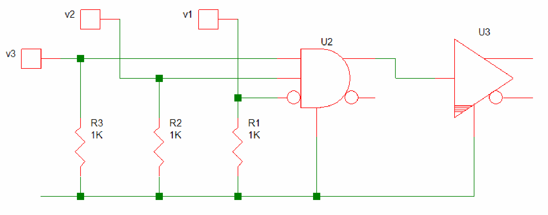 2. If most or all inputs to a simple logic gate are required to be connected to classic components, the simulation will run faster if a classic digital component is used as a front-end to drive a buffer from the Advanced Digital component library. For example, if all inputs to a three-input AND-gate are connected to classic analog components, a valid option is to have an Advanced Digital 3-input AND gate to sense the three analog inputs directly: