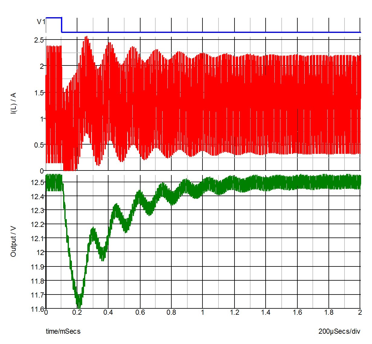 After the POP analysis is finished, SIMPLIS carries out a regular time-domain transient simulation according to the .TRAN statement for 2000s. As explained in How POP Deals with Time Varying Sources, the source value of VI will be at 40V for the first 100s in this transient simulation and at 30V for the rest of the simulation. Waveforms as obtained in this time-domain transient analysis for V(VI), V(RL), and I(L) are shown in fig 10.9 .
