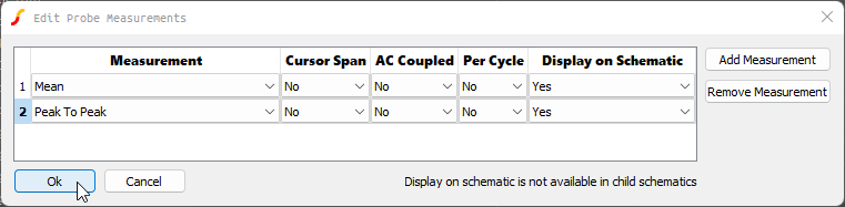 Any built-in or user defined measurement can be added to the fixed probes on the schematic.