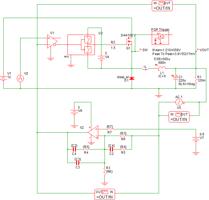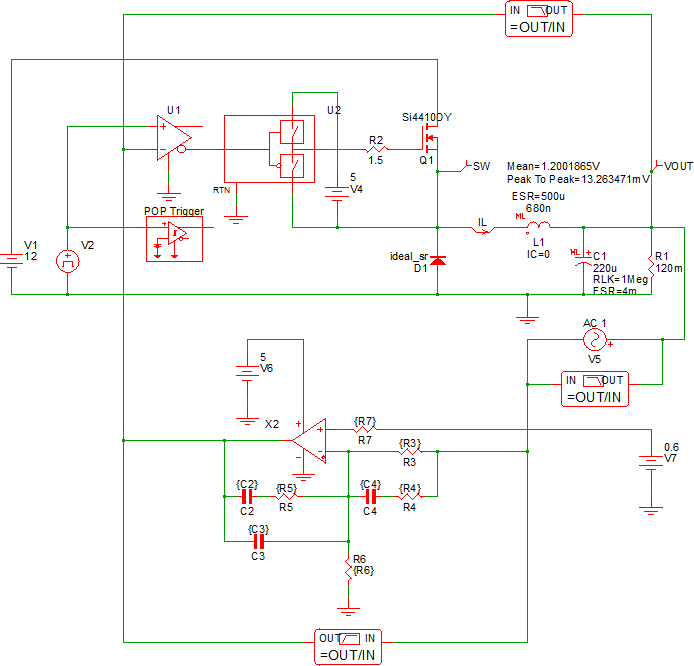 • Solution 1: Change the initial conditions of the circuit to initialize the circuit closer to the steady-state conditions. The compensator will then make small corrections to bring the converter into steady-state; the duty cycle will never reach 0 or 100%; and the POP analysis will succeed. This is a good design practice and you will probably need to do this at some point, especially with a more complex circuit.