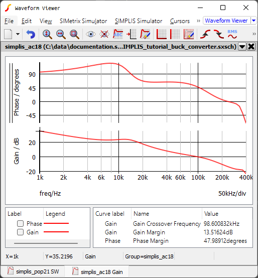 Result: The simulation runs without errors and the bode plot for the converter is output to the waveform viewer. The Gain Crossover Frequency is 98kHz, the Phase Margin is 48 degrees and the Gain Margin is 13.5dB.