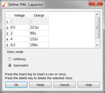 These Voltage-Charge point pairs are input on a PWL table dialog, which is opened by clicking on the "Define..." button: